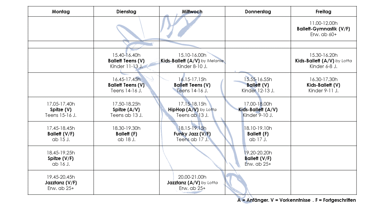 In unseren Kursen für Kinder ab 6 Jahren entdecken wir gemeinsam die faszinierende Welt des Balletts. Mit spielerischen Bewegungen zur Musik entwickeln die Kinder ein Gefühl für Rhythmus, Körperwahrnehmung und Ausdruck. Schritt für Schritt erlernen sie erste technische Grundlagen des klassischen Balletts - stets altersgerecht und mit viel Freude an der Bewegung. Durch kreative Choreografien wird das Gespür für Musikalität und Dynamik gefördert. Auch Jugendlichen und Erwachsenen bietet Ballett eine wertvolle Möglichkeit, Körper und Geist in Einklang zu bringen. Das vielseitige Bewegungsvokabular verbessert Koordination, Haltung und stärkt die gesamte Physis - unabhängig von Alter oder Vorkenntnissen.